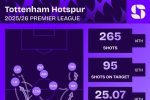 据Squawka统计,热刺本赛季英超预期进球仅为25.07粒,但打进35球,超出预期进球9.93粒,热刺是本赛季英超实际进球超出预期进球最多的球队。