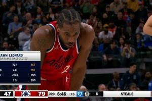 伦纳德在场快船进攻效率联盟第4&净效率第8 不在场则是第28&第26