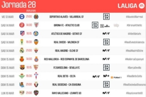 体育资讯2月19日讯 西甲官方公布联赛第28轮各场开球时间,3月15日4:00皇马vs埃尔切,23:15巴萨vs塞维利亚。
