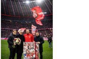 体育资讯2月21日讯 本轮德甲拜仁对阵法兰克福的比赛正在进行,赛前凯恩接受球队为其制作的生涯500球纪念品,并与球队诸位高层合影留念。