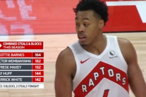 转播方统计,巴恩斯本赛季抢断+盖帽之和164次,超越文班排名联盟第一。