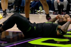 探囊取物!贾勒特·阿伦篮下接球 点飞防守轻松单臂扣进