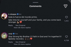 姆巴佩写道:“把全世界的力量都给你,兄弟。为自己和家人好好休养,你会以更强大的姿态归来!”
